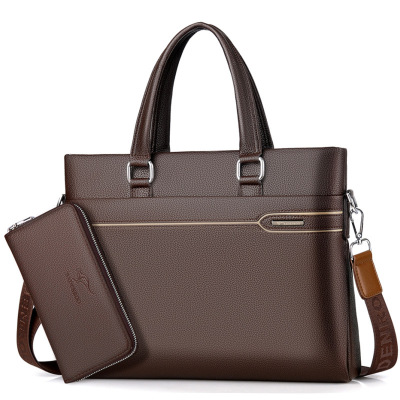 MKJ百搭男士手提包文件包斜挎包商务公文包横款电脑包韩款大容量男包14寸 黑色+赠送同款手包钱包