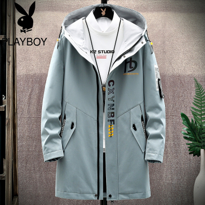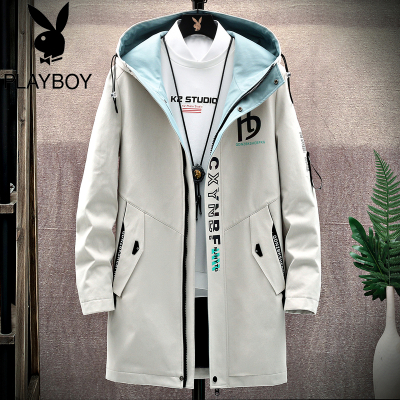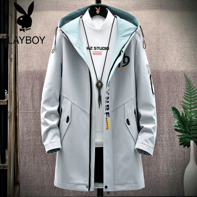 花花公子男士夹克中长款风衣2024新款韩版潮流连帽外套休闲上衣服