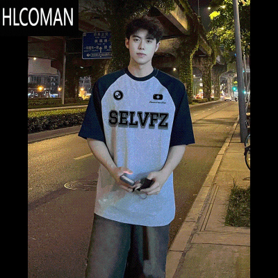 HLCOMAN美式潮牌撞色插肩短袖t恤男款夏季高街宽松拼接半袖上衣