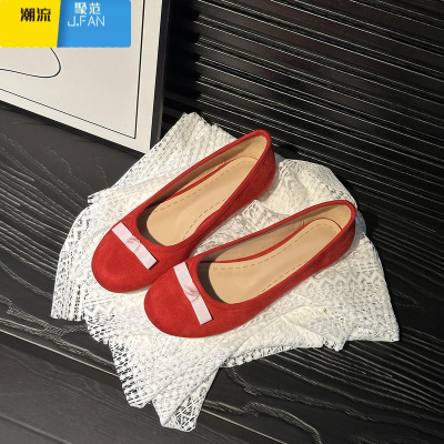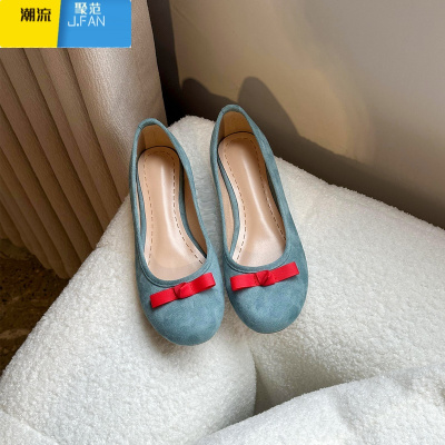 聚范皮版~法式蝴蝶结圆头芭蕾舞鞋女蓝色平底鞋仙女晚晚风浅口单鞋