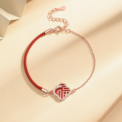 原创银饰手串手绳纯银龙年复古本命年转运编织红绳手链发财麻将送女朋友老婆情人节七夕生日礼物 均色
