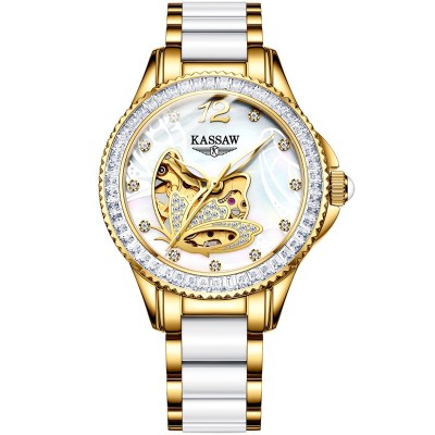 卡梭(KASSAW)手表女士白色新款自动机械表防水时尚商务陶瓷雕花镂空女表 K889L