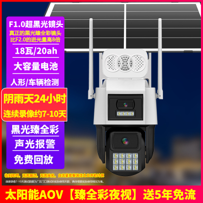 1、黑光臻全彩夜视。2、5年免费流量。3、20瓦太阳能板。4、28AH大容量电池