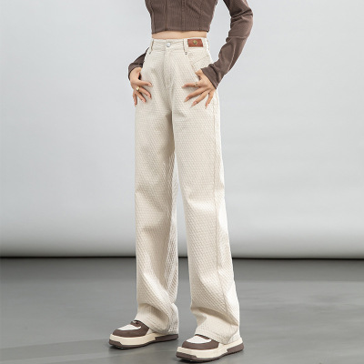 年秋季新款提花牛仔裤女米白色高腰创意皮标宽松阔腿长裤
