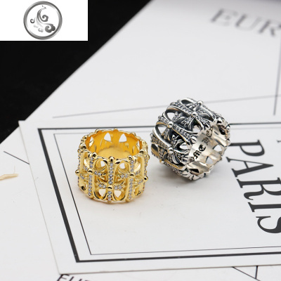 S925纯银饰品克罗星戒指时尚韩版镶钻镀金情侣对戒男款宽版指环 JiMi