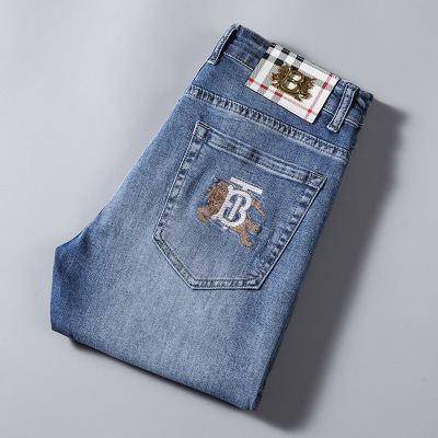 意大利高端刺绣牛仔裤男士潮牌蓝色夏季薄款弹力修身小脚休闲长裤